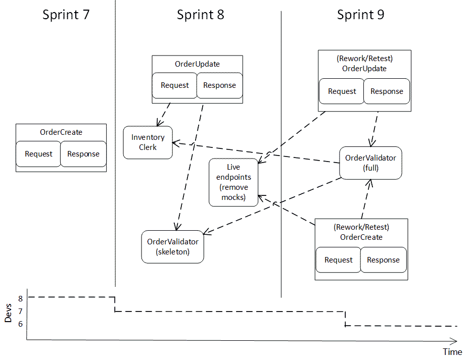 An additional risk on the OrderValidator led the team to choose first constructing a skeleton, or thin thread, OrderValidator in Sprint 8 to prove the component design was correct, and then add the full execution of business rules in Sprint 9. But both OrderCreator and OrderUpdater ultimately depend on the full, finished OrderValidator, and this forced rework in Sprint 9 onto the OrderCreator and OrderUpdater components.